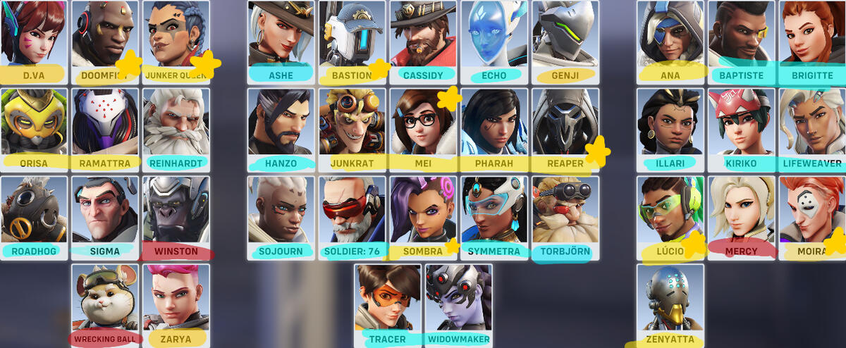 YELLOW - MAIN FOR SAID CATEGORY / I PLAY REGULARLY / CONFIDENT INBLUE - I CAN PLAY, BUT DONT REALLY SUPER OFTEN / NOT THAT CONFIDENTRED - I ALMOST NEVER PLAY THIS CHARACTER / I SUCK AT THEM